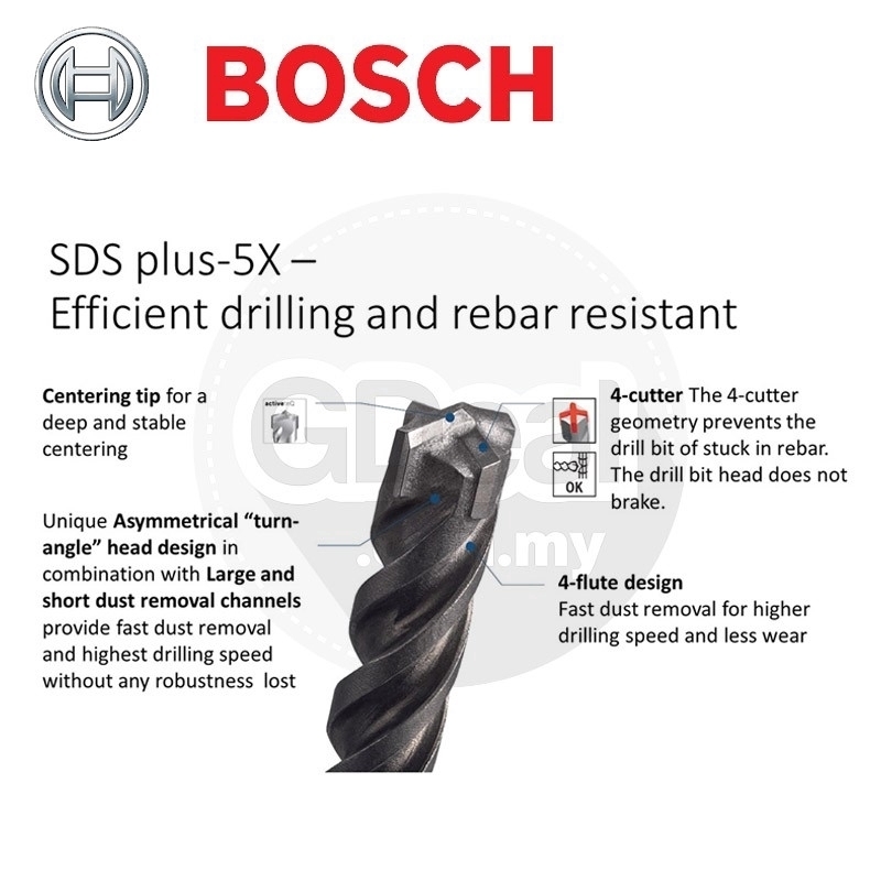 SDS plus-5X svrdlo osigurava visokoučinkovito bušenje u armiranom betonu - Geometrijski oblik glave sa 4 oštrice sprečava zaglavljivanje i pucanje za optimalne rezultate - Asimetrična glava i 4-spiralni dizajn osiguravaju brzo odvođenje prašine za povećanu brzinu i smanjeno trošenje - Odgovara svim svrdlima za bušaće čekiće s prihvatom SDS plus