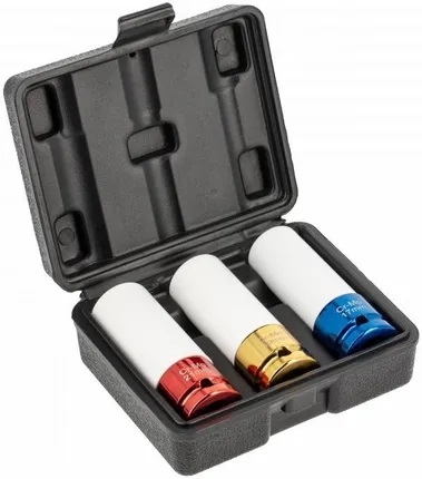 Set 1/2" udarnih gedora za aluminijumske felne. U setu su dostupne popularne veličine 17 mm, 19 mm i 21 mm. - izrađeni od visokokvalitetnog CrMo legiranog čelika koji osigurava dug radni vijek, izdržljivost i otpornost na deformacije i pucanje - izdržljivo, dizajnirano za kontinuirani rad pod teškim opterećenjem - šareni završetak kapica osigurava brzu identifikaciju veličina - zaštitni omotač od mekanog materijala štiti felne od ogrebotina i drugih oštećenja - plastična kutija za lakše skladištenje