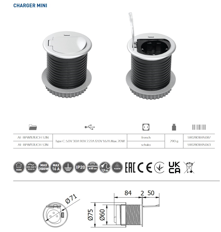 AE-BPW1S1UCH-53N Konzola CHARGER MINI fi 60mm sa utičnicom / USB C / kabal 1.9m