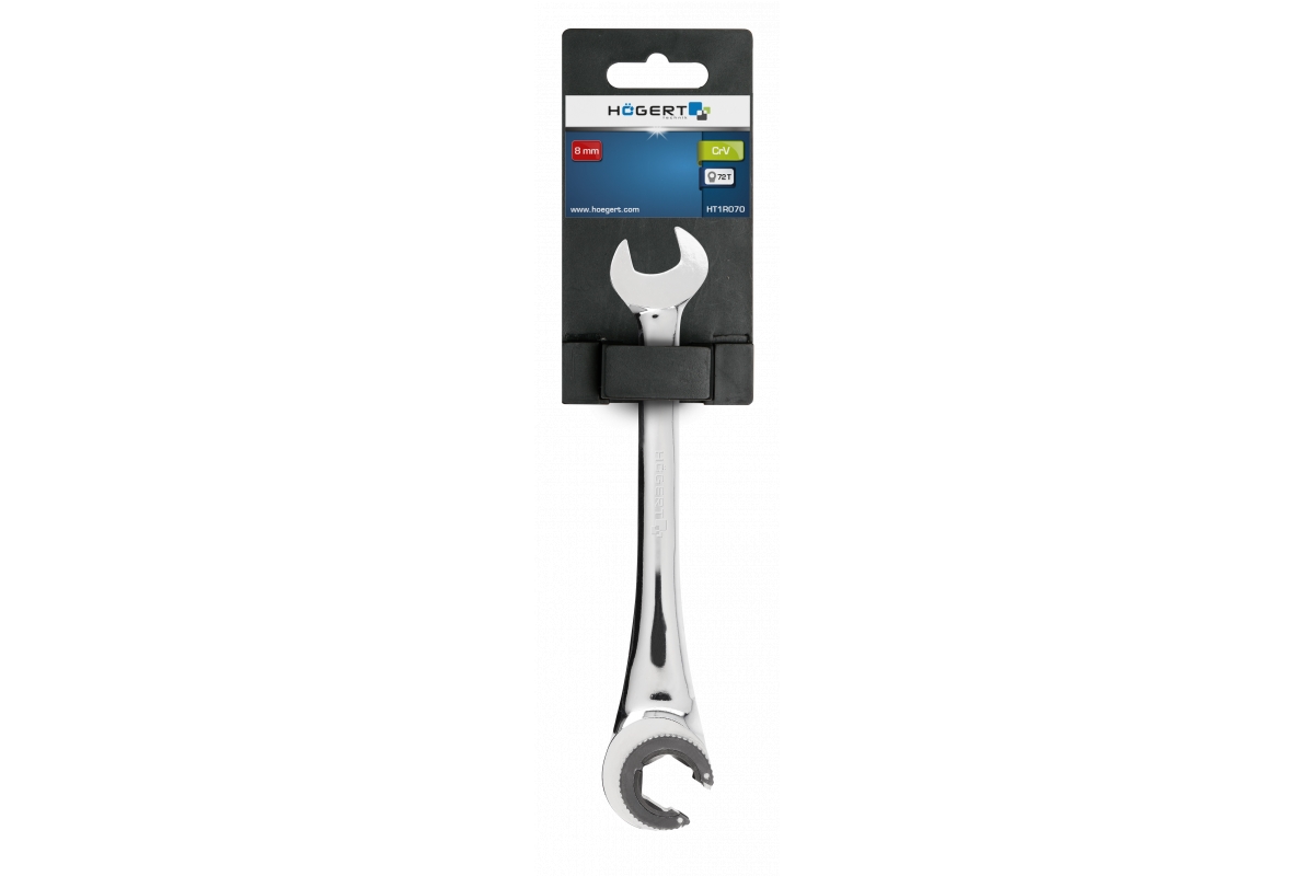 Ključevi sa račnom služe za lakše zavrtanje i odvrtanje šarafa i matica. Zahvaljujući račni nema potrebe prebacivanja ključa, što uveliko skraćuje vrijeme potrebno za rad. Konstrukcija poluotvorenog mehanizma račne pruža mogućnost postavljanja ključa na svakom izabranom mjestu. - izrađen od visokokvalitetnog legiranog hrom-vanadij čelika, čvrstog i izdržljivog, savršenog materijala za ključeve - šestougaona okasta strana sa mehanizmom čegrtaljke - precizan mehanizam čegrtaljke sa 72 zuba - poluotvorena konstrukcija mehanizma čegrtaljke pruža mogućnost postavljanja ključa na navoje bez obzira na dužinu istih, slično kao u slučaju ravnog kraja - ravna strana ključa pod uglom 15° radi optimalnog dostupa pričvrsnom elementu