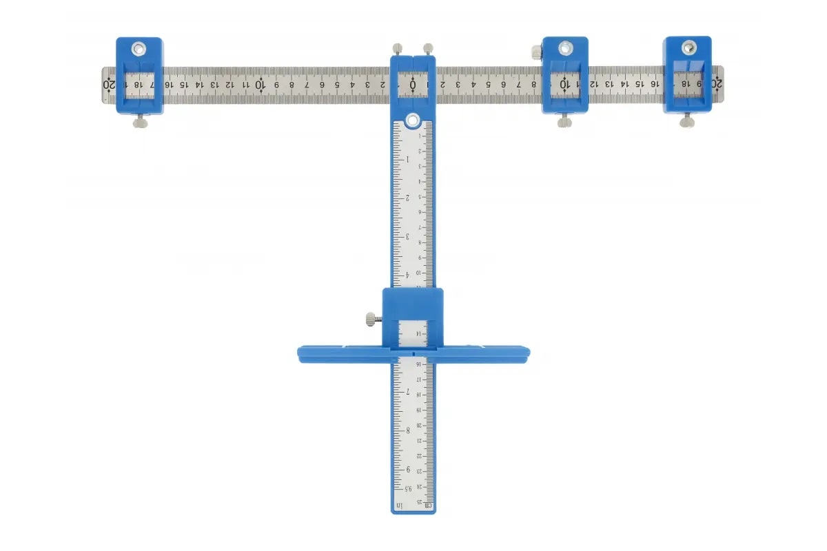 Šablon sa klizačem je dizajniran za precizno obilježavanje tačaka bušenja. Uglavnom se koristi u stolariji. Glavna šina omogućava obilježavanje tačaka, do 250 mm dubine u prednjoj strani nameštaja. Na gornjem dijelu alata nalazi se pokretna čelična šina na kojoj su postavljena tri klizna markera za precizno obilježavanje tačaka bušenja. Istovremeno, moguće je odrediti četiri rupe na različitim međusobnim rastojanjima i blokiranjem podešavanja napraviti oznake za rupe na sledećoj prednjoj strani. Šablon olakšava obilježavanje tačaka bušenja u različitim materijalima, npr. drvetu, metalu, plastici. Graničnik koji se nalazi na lijevoj stezi, kada je postavljen u upravnom položaju, stabilizovaće alat u horizontalnom ili vertikalnom položaju. Sve 3 stege imaju šaraf za stezanje, tako da se podešena dimenzija može ponovo koristiti na sledećem predmetu koji treba obilježiti. Šina je napravljena od nerđajućeg čelika i aluminijuma, a elementi za podešavanje su napravljeni od visokokvalitetne ABS plastike. - maks. razmak između oznaka 400 mm - maks. dubina oznake naprijed - 250 mm - prečnik otvora - 5 mm