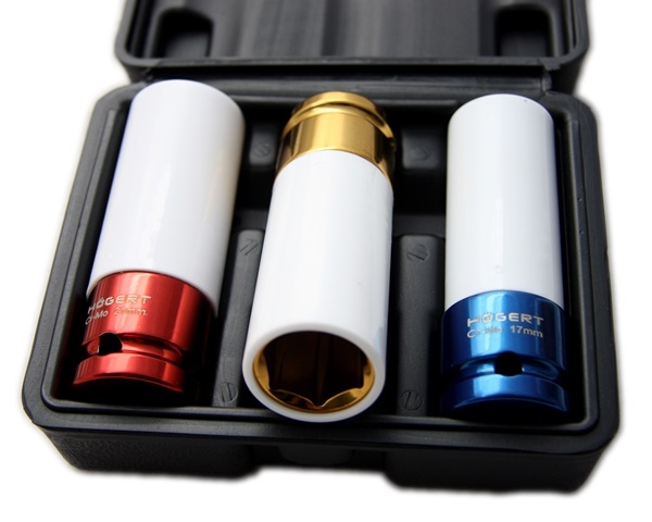 Set 1/2" udarnih gedora za aluminijumske felne. U setu su dostupne popularne veličine 17 mm, 19 mm i 21 mm. - izrađeni od visokokvalitetnog CrMo legiranog čelika koji osigurava dug radni vijek, izdržljivost i otpornost na deformacije i pucanje - izdržljivo, dizajnirano za kontinuirani rad pod teškim opterećenjem - šareni završetak kapica osigurava brzu identifikaciju veličina - zaštitni omotač od mekanog materijala štiti felne od ogrebotina i drugih oštećenja - plastična kutija za lakše skladištenje